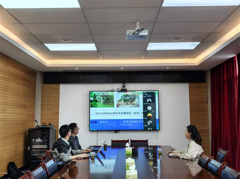 为扎实推进贵州省古树名木监测复核调查项目工作,明确年度任务与技术规范,确保项目高效有序实施,4月17日,贵州省林科院组织召开项目2026年工作推进会。会议采取线上线下相结合的方式进行,线下会场设在贵州省林科院,项目核心成员现场参会;线上会议同步进行,各片区调查组负责人、技术骨干及各小组负责人等参加,来自贵州大学、贵州省林业勘察设计有限公司、铜仁学院等单位的相关人员共同参与。