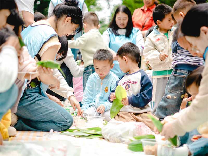 包粽子环节变身“微型科研现场”。林科院专家现场解密箬叶的植物学特性,孩子们在家长指导下完成从折叶、装米到缠线的全流程实践。“糯米相当于实验样本,粽叶就是天然包装材料。”博士侯娜边示范边讲解,将科研思维融入生活技能。