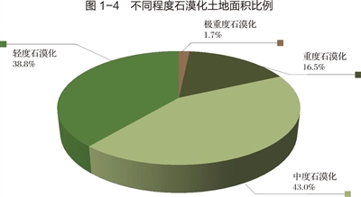 轻度石漠化土地面积为391.3万公顷,占石漠化土地总面积的38.8%;中度石漠化土地面积为432.6万公顷,占43%;重度石漠化土地面积为166.2万公顷,占16.5%;极重度石漠化土地面积为16.9万公顷,占1.7%(图1-4)。