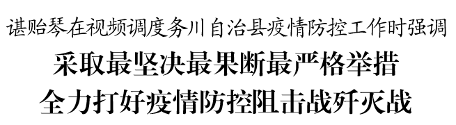 3月15日,省委书记、省人大常委会主任、省应对新冠肺炎疫情防控领导小组组长谌贻琴通过视频方式调度务川自治县疫情防控工作。她强调,要深入贯彻习近平总书记关于疫情防控工作的重要指示精神,把疫情防控作为重大政治任务和做好一切工作的前提基础,坚决落实“外防输入、内防反弹”总策略、“动态清零”总方针,以最坚决最果断最严格的举措抓好疫情应急处置,用最短时间扑灭疫情,坚决守护好人民群众的身体健康和生命安全。省领导时光辉、郭锡文在务川自治县分会场参加会议并汇报相关情况。