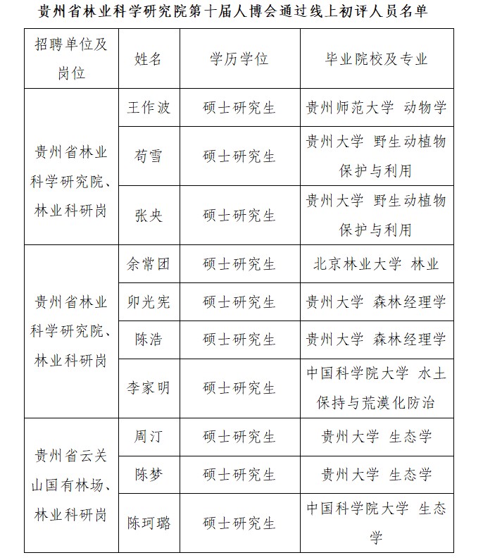 根据《贵州省人力资源和社会保障厅关于做好第十届贵州人才博览会事业单位引进人才有关工作的通知》(黔人社通〔2022〕49号)文件要求,现将我院第十届人才博览会通过线上初评人员进行公示。公示期间,如有异议,请向我单位反映。