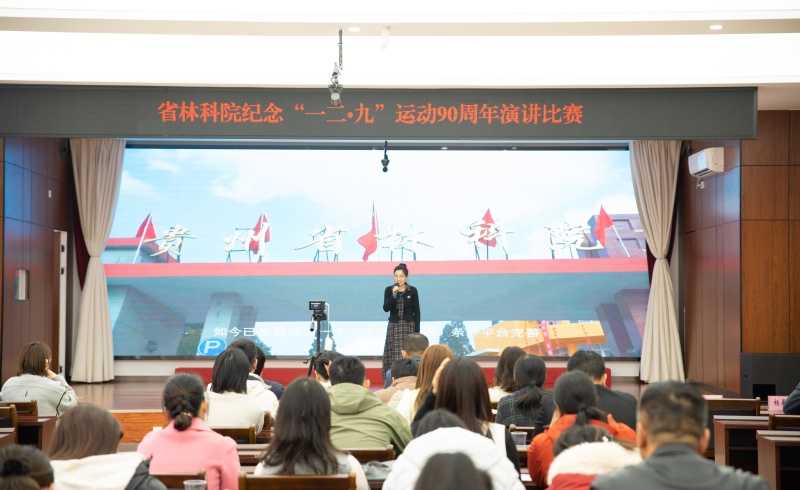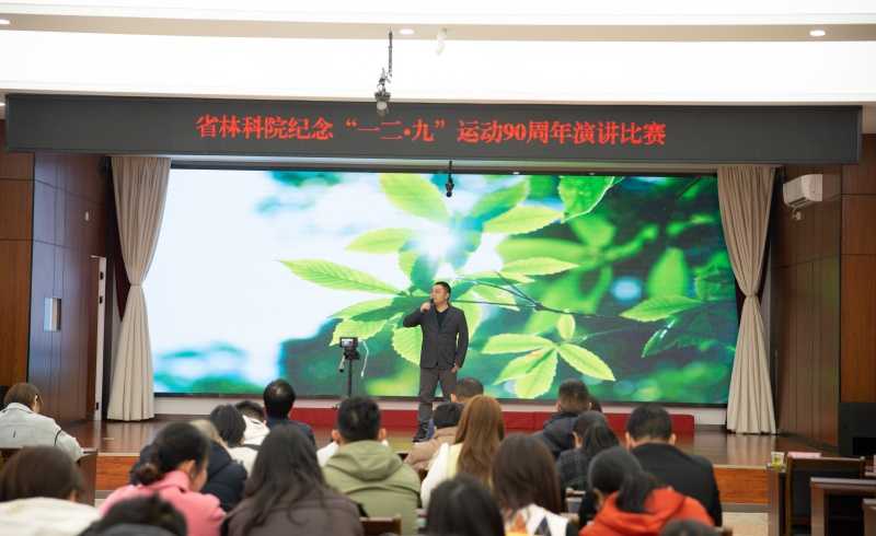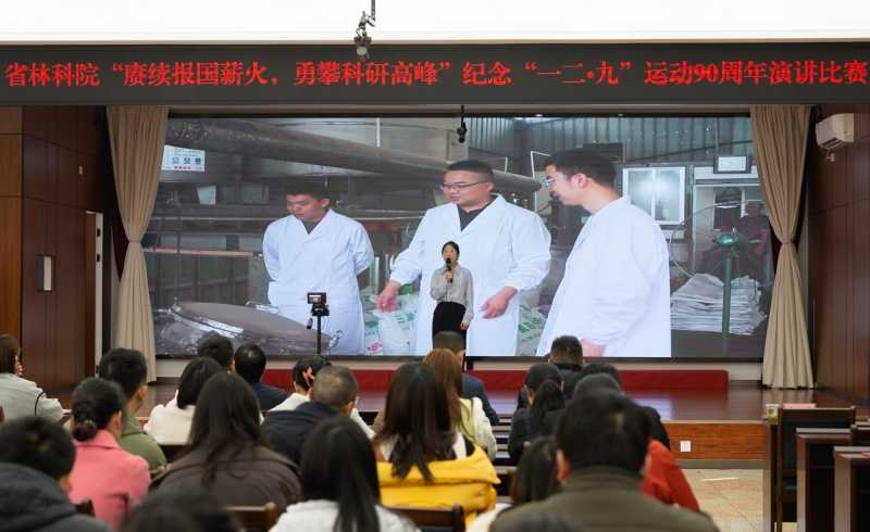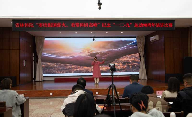 为纪念“一二·九”运动90周年,弘扬爱国主义精神,激励青年科技工作者勇担使命、奋发有为,12月8日省林科院举办主题为“赓续报国薪火,勇攀科研高峰”的演讲比赛。省农林水利气象工会主席庞仁杰、省林业局团工委书记吴晓悦、省湿地和公益林保护中心副主任文弢到场指导。