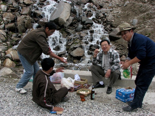 钟扬(右二)与西藏大学师生在西藏采集种子时在野外用餐。(资料照片)