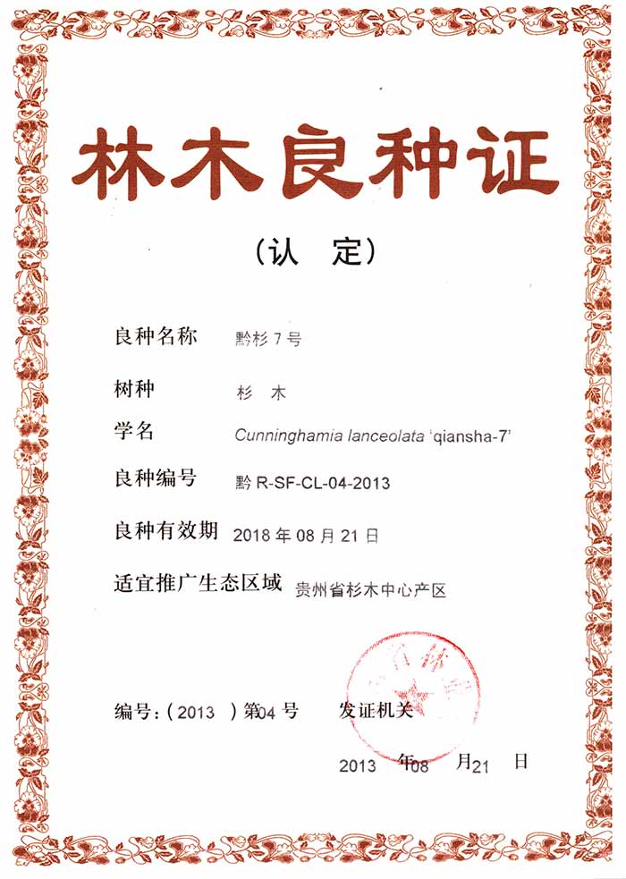 树冠形态浓密,青绿色披针形叶。果型卵圆形,紧苞宽鳞。干形通直圆满,树皮薄、D1.3皮厚8.34mm。木材纹理通直,结构均匀,干缩率小,尖削度小,木质轻韧。无性繁殖能力强,造林成活率高。抗病性强。杉木中心产区立地指数18造林后5a的单株材积现实增益比CK1提高52.6%%,比CK2提高178.2;单株材积遗传增益比CK1提高33.1%,比CK2提高112.3%。种子千粒重5.59g,室内发芽率50%,场圃发芽率39%。