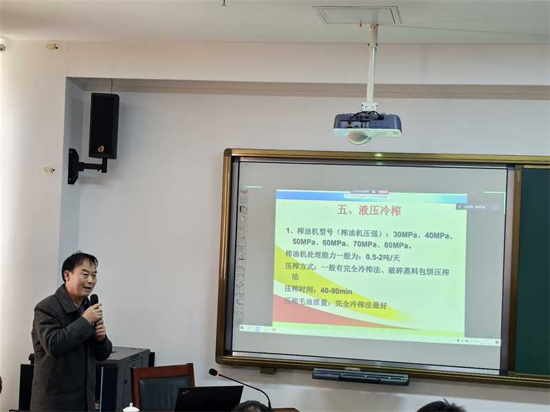 会上,郭少海详细讲解了油茶采后处理技术中关于油茶果的采收标准和采收后的干燥工艺对茶油品质的影响,对螺旋压榨、双螺杆压榨、液压冷榨和溶剂萃取等制油方式的存在的问题、操作方法和富营养油茶籽油的加工技术等内容进行了详细介绍。会议还聆听了其他专家“关于云南高原山地油茶资源挖掘与利用、油茶风味特征及外源氨基酸辅助风味油脂制备、基于精准适度加工的安全营养风味油茶籽油标准生产技术要点”等内容的精彩报告。