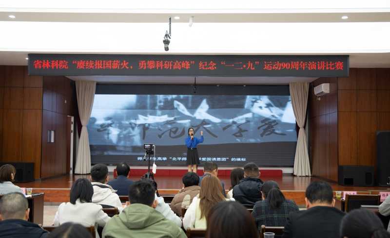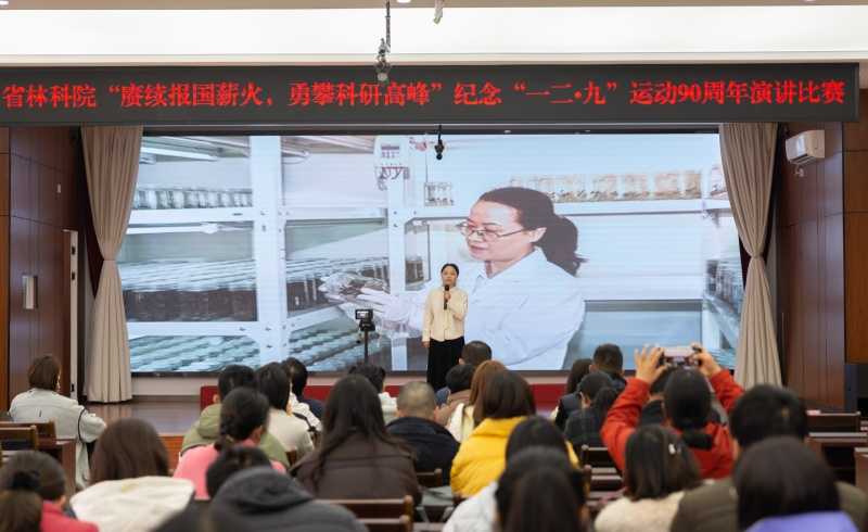 为纪念“一二·九”运动90周年,弘扬爱国主义精神,激励青年科技工作者勇担使命、奋发有为,12月8日省林科院举办主题为“赓续报国薪火,勇攀科研高峰”的演讲比赛。省农林水利气象工会主席庞仁杰、省林业局团工委书记吴晓悦、省湿地和公益林保护中心副主任文弢到场指导。