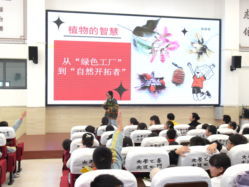 下午党员组成科普团队走进省府路小学(恒大帝景分校),开展《植物的智慧——从“绿色工厂”到“自然开拓者”》的科普讲座。科普团队巧妙地将深奥的植物学知识转化为生动有趣的科普内容,通过丰富的图片、动画和实物展示,深入浅出地讲解了叶片如何进行光合作用揭示这座“绿色工厂”的运转机制,以及形态各异的种子如何通过各种智慧方式扮演“自然开拓者”的角色,完成生命的传播与延续。同学们被奇妙的植物世界深深吸引,纷纷举手提问,积极参与讨论讲座现场气氛活跃,互动频繁。