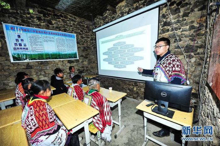 在毕节市威宁彝族回族苗族自治县石门乡团结村七里冲组脱贫攻坚讲习点,村支书胡钧溥在向当地群众讲解十九大精神及相关的扶贫政策(2017年10月23日摄) 新华社记者 陶亮 摄