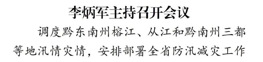 6月24日,省委副书记、省长李炳军主持召开会议,深入学习贯彻习近平总书记关于防汛救灾工作重要指示精神,调度黔东南州榕江、从江和黔南州三都等地汛情灾情,安排部署全省防汛减灾工作。省领导吴强、董家禄、张敬平、罗强、杨同光、郭成林参加。